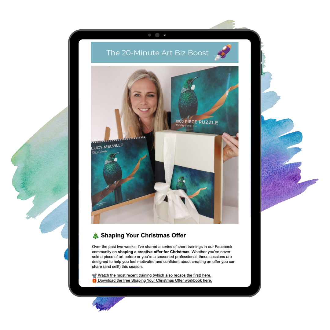 Three years ago, I left my role as director of one of the biggest construction consultancies in New Zealand to take a chance on my creative business full time. I now spend my days creating and selling my own work, alongside helping artists like you get on the path to creating thriving, self-sufficient art businesses that reflect your authentic artistic essence.
